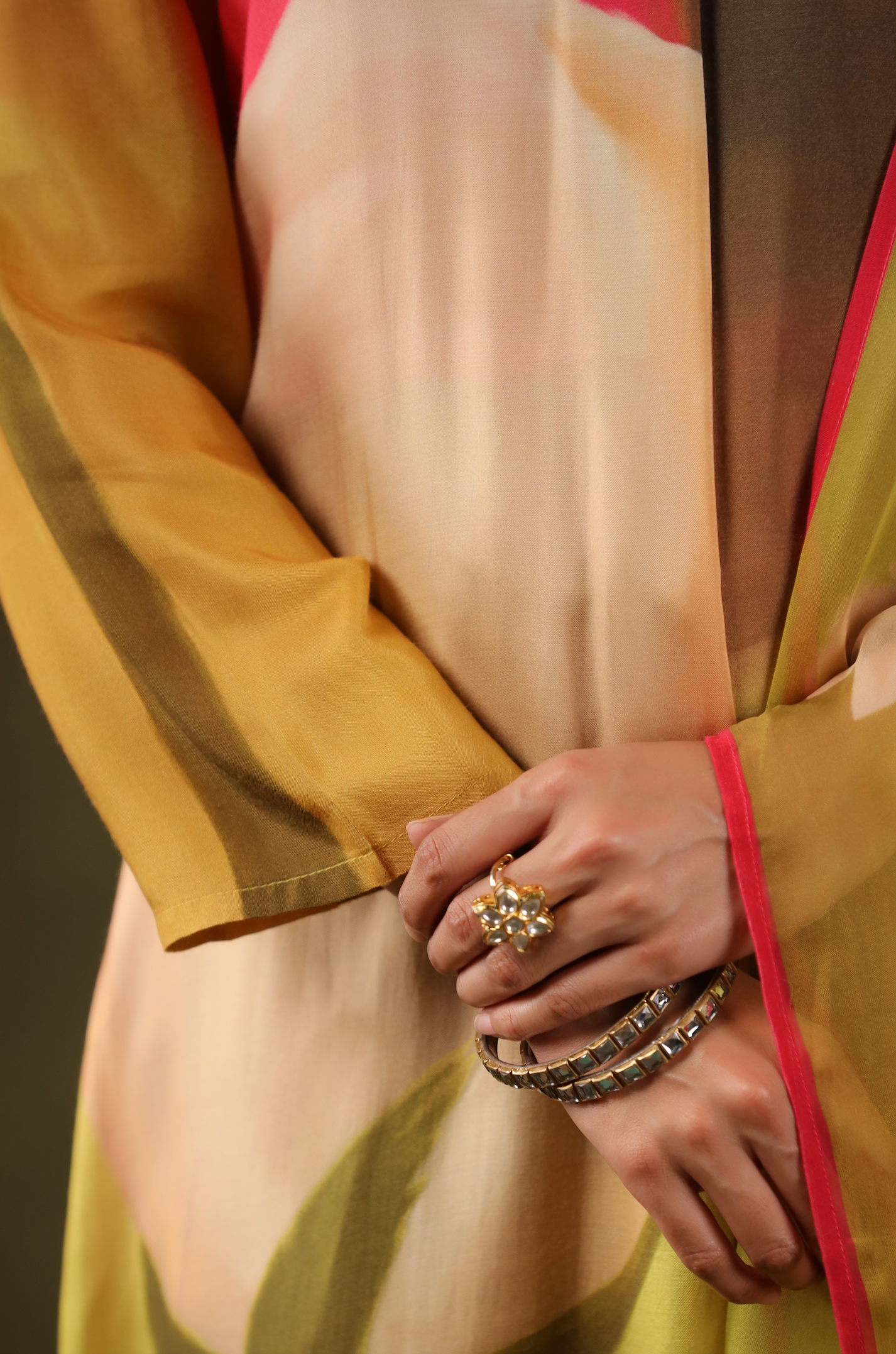This three piece suit set includes Pure Muslin Printed Straight kurta with handwork embroidery on neckline paired with pure organza Printed dupatta and straight fit solid colour shantoon pants to complete the look.