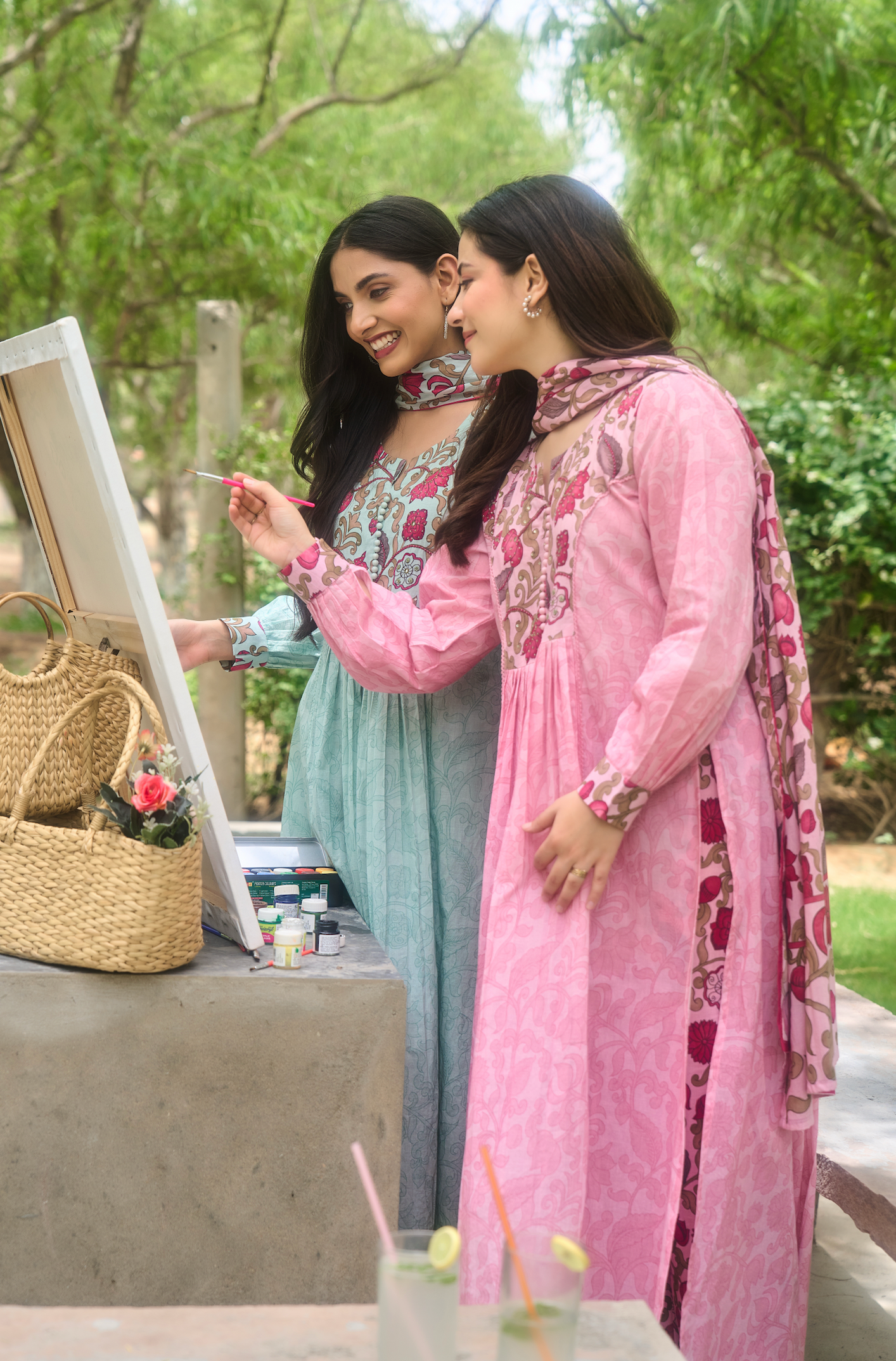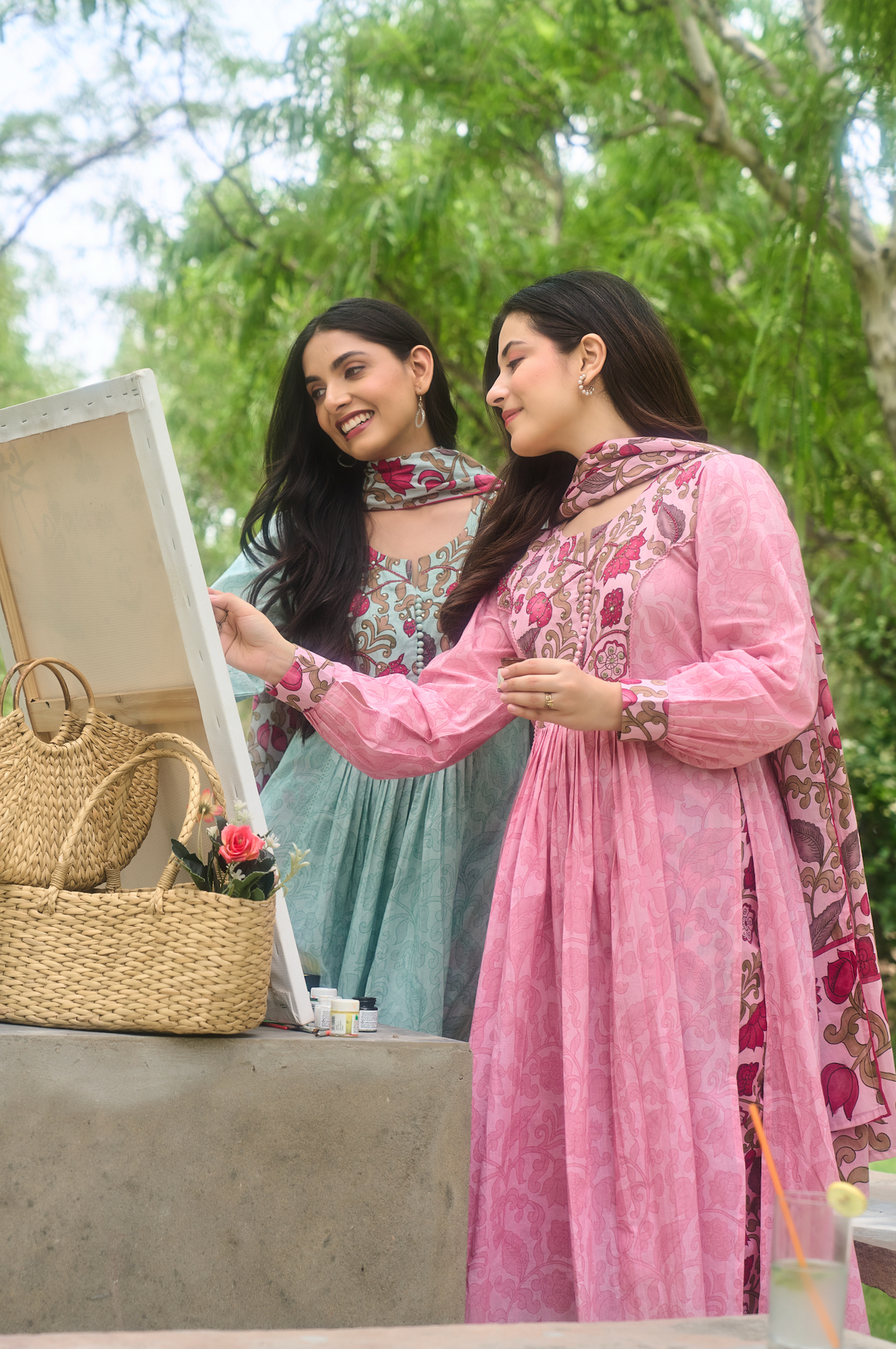Crafted in soft mul cotton, this flared Nyra-cut kurta features delicate all-over prints and subtle adda work on the yoke and sleeves. Paired with a vibrant printed cotton pant and a matching floral dupatta, this ensemble brings comfort and effortless grace for day outings and festive brunches alike.